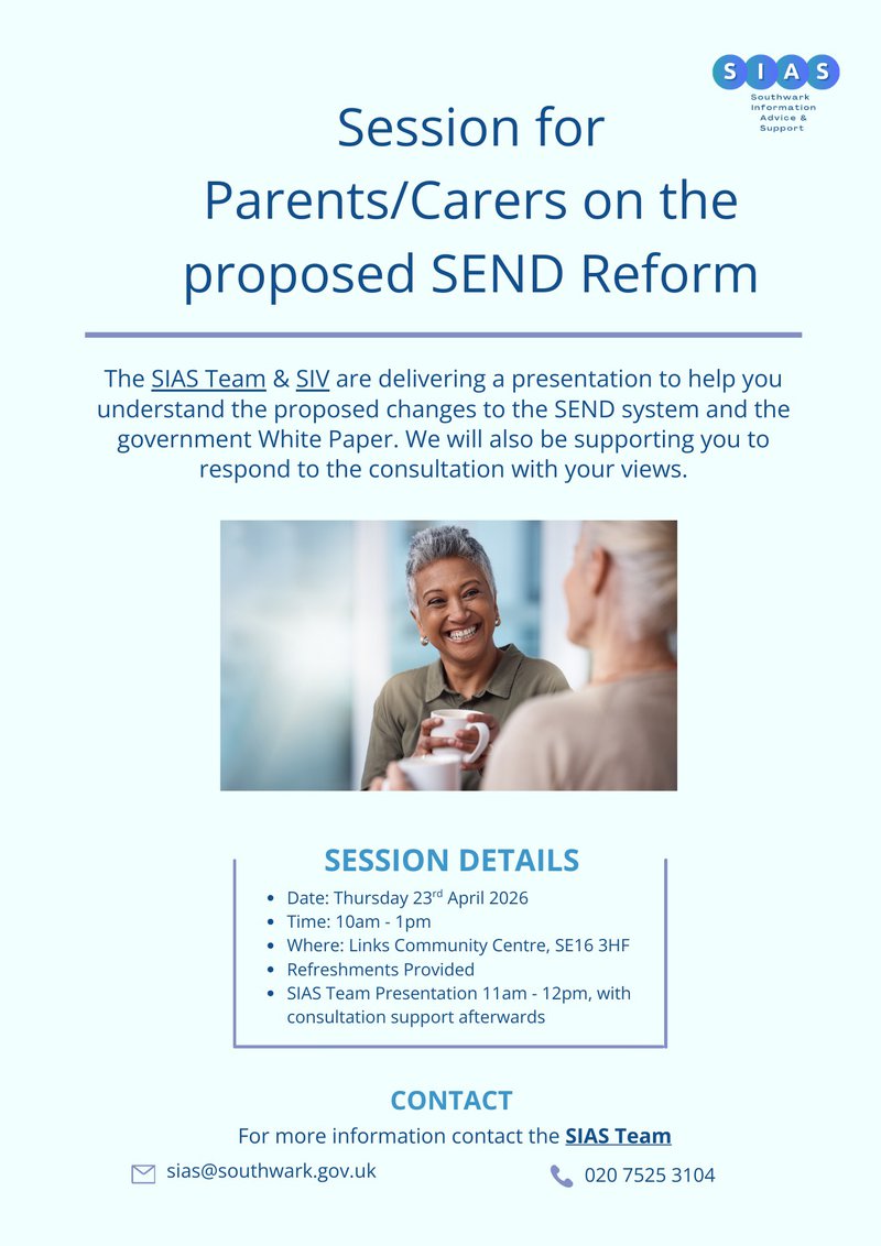 Southwark Independent Voice hosting a coffee morning with Southwark Information Advise Service to help parent carers understand the SEND Reforms and how to participate in this consultation.