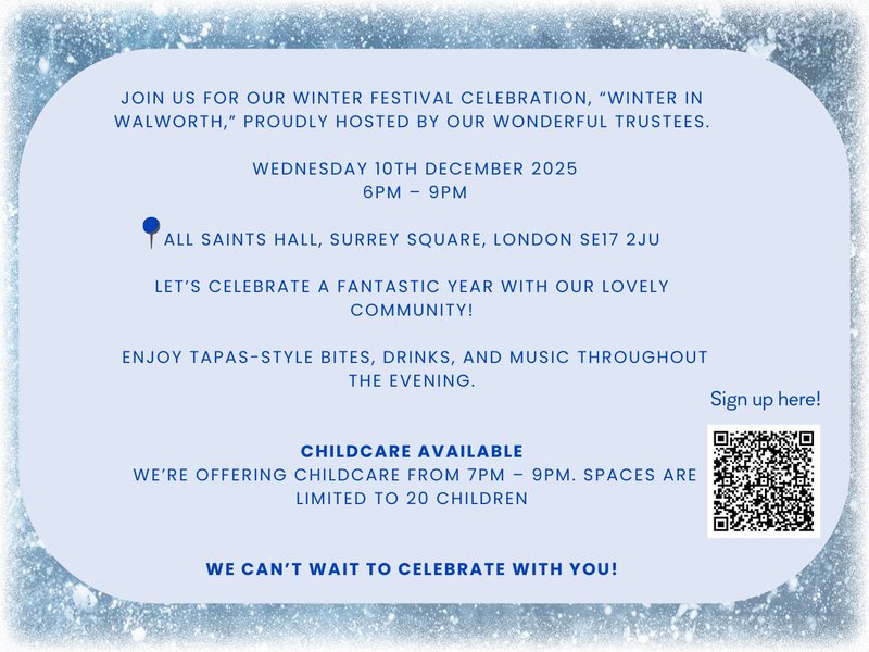 Join us for a wonderful celebration of Winter in Walworth at All Saints Hall – just over the road – next Wednesday. Register with this link!